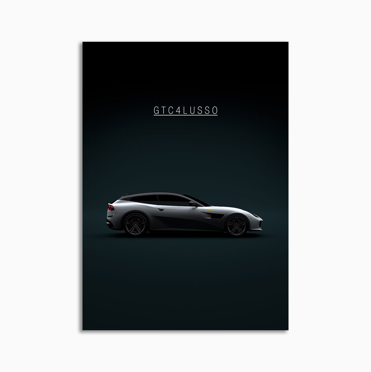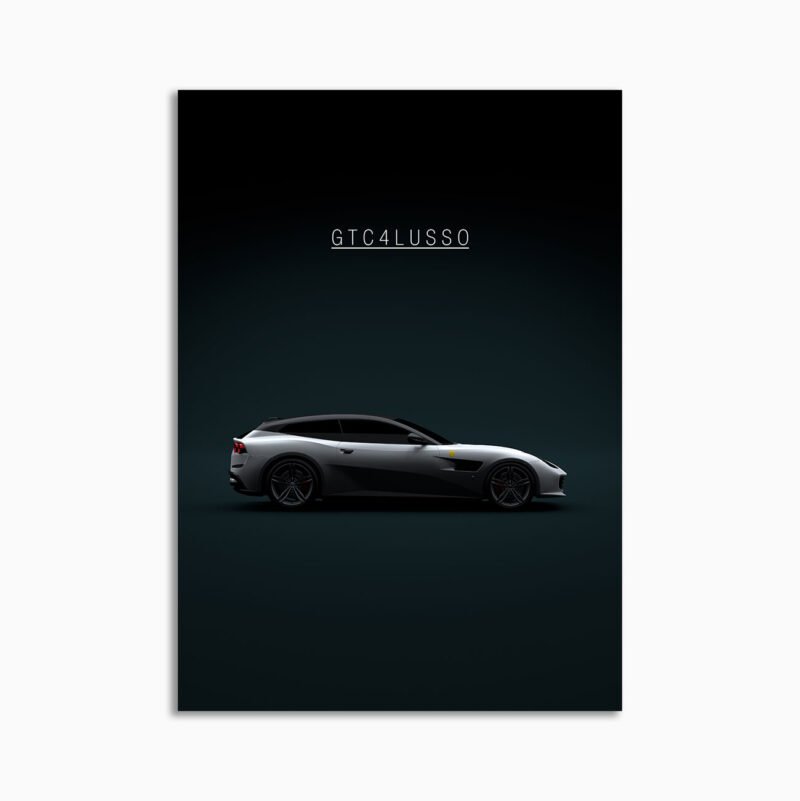 This Ferrari GTC4 Lusso 2017 white and black digital poster is minimalist automotive wall art designed for modern interiors. It emphasizes silhouette, proportion, and a premium, gallery-like presentation.