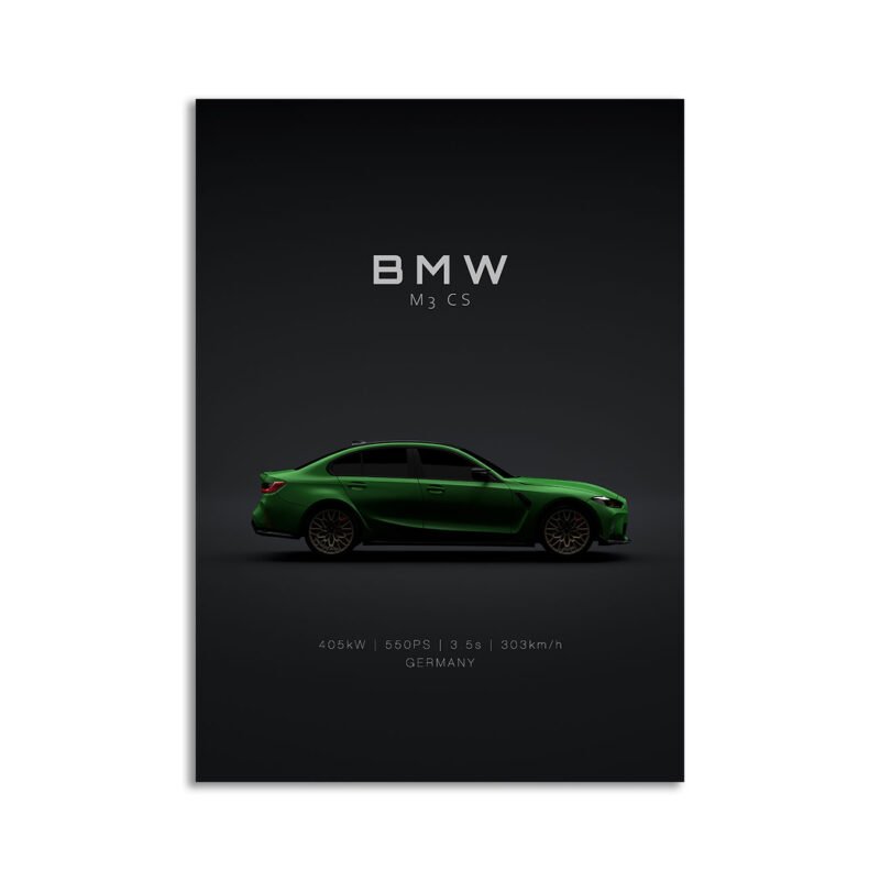 This BMW M3 CS 2023 Green digital poster is clean, technical automotive wall art with a detail-forward, premium look. It’s built for modern interiors where less is more – strong silhouette, controlled contrast, and a focused composition.