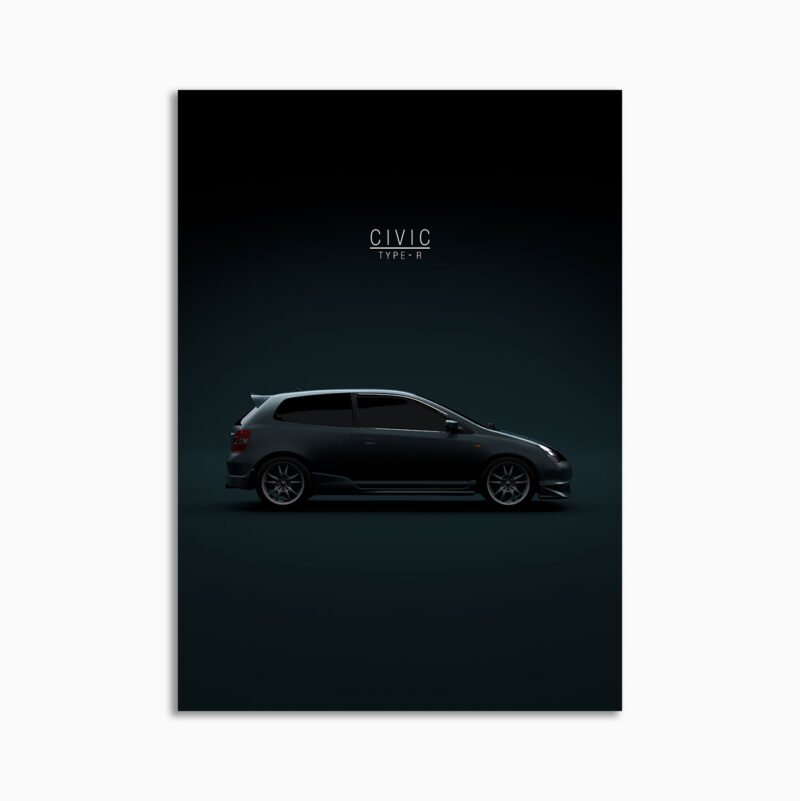 This 2002 Honda Civic Type-R EP3 digital poster is minimalist automotive wall art designed for modern interiors. It emphasizes silhouette, proportion, and a premium, gallery-like presentation.